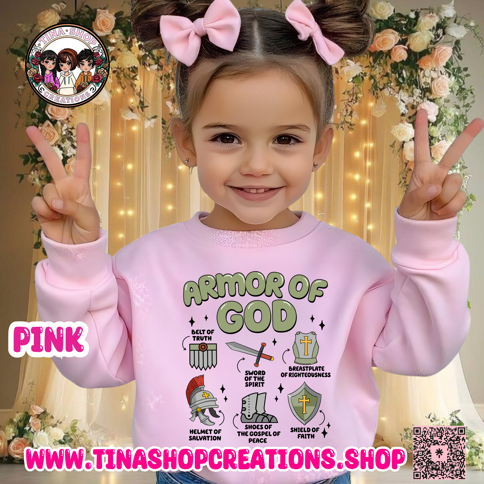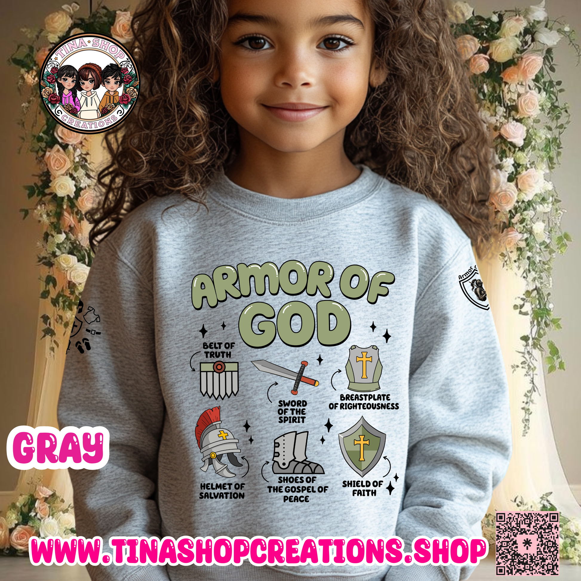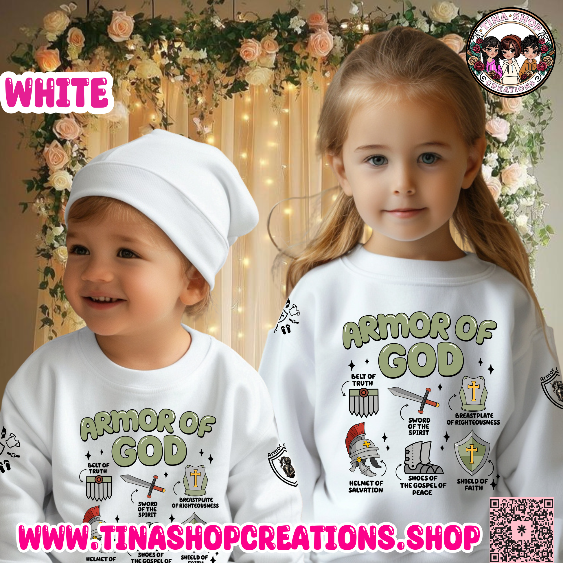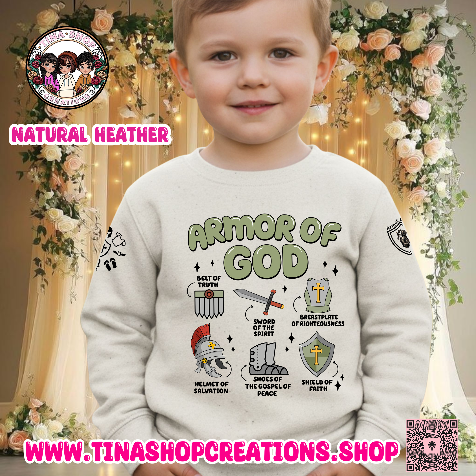 Available as both a soft T-shirt and cozy sweatshirt, this design is inspired by Ephesians 6:10-18, reminding children to stand strong in truth, righteousness, peace, faith, and salvation.