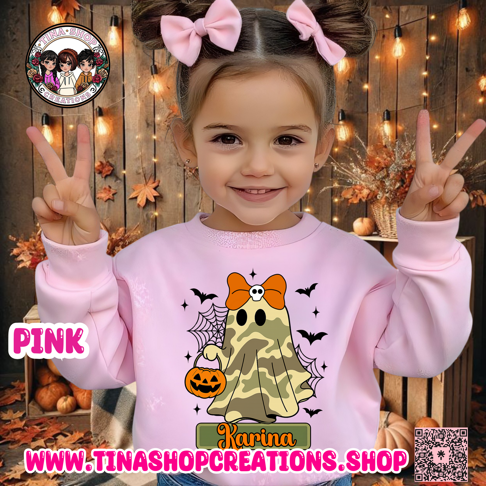 Get your little one ready for spooky season with this adorable, personalized camo ghost Halloween shirt or sweatshirt! Choose between the boy ghost with a hat or the girl ghost with a bow, both holding a pumpkin candy bucket and customized with your child’s name for a special touch.